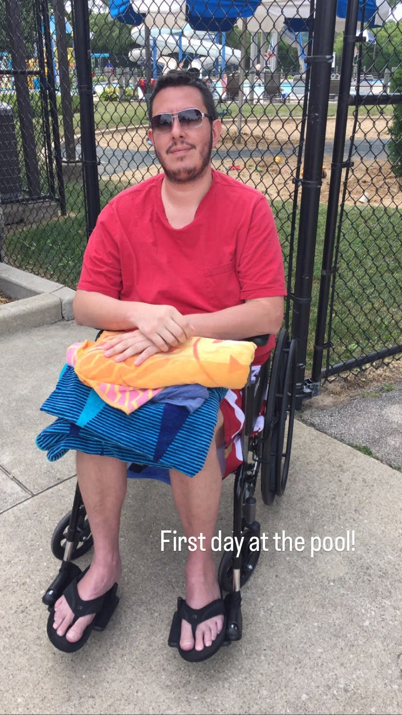 My mom supports me in a controlled fall I rehearsed in rehab with my physical therapist.
